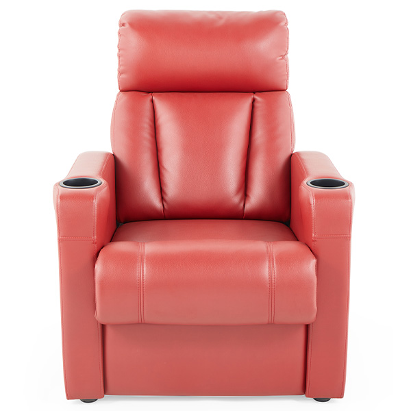 ①Handrail:Made from carefully selected eco-friendly solid wood through a shaping process. The cup holder can be equipped with a slot for placing a mobile phone and a middle tube for popcorn. The cup holder is made of ABS New material injection molding, with the option to install luminous number plates.